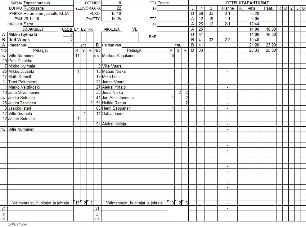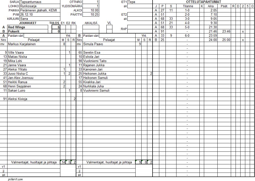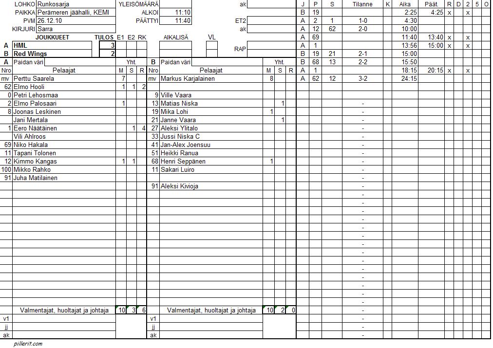 | 10 | 15:10 | Mikko Kylmälä | - | Red Wings | 2 | - | 2 | |