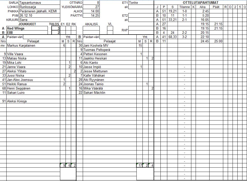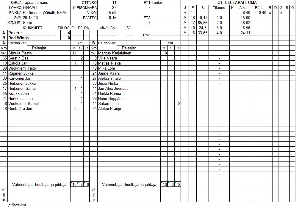 | 11 | 15:50 | Pokerit | - | Red Wings | 4 | - | 0 | |